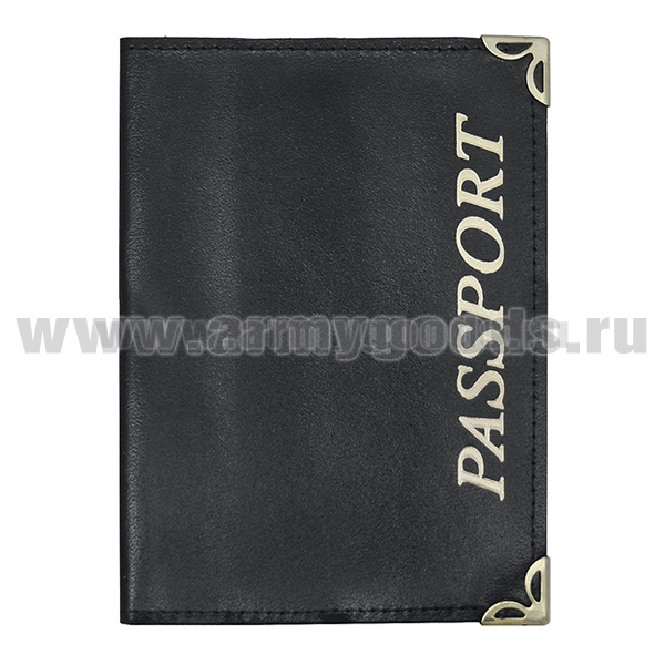Обложка кожа Passport (черная горизонтальная) с мет. уголками и прорезями для кредитных карт
