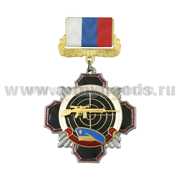 Медаль Стальной черн. крест с красн. кантом Снайпер (голубой берет) (на планке - лента РФ)
