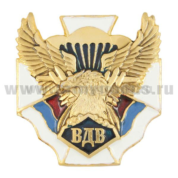 Значок мет. ВДВ (орел, крылья вверх на бел. кресте) с флагом РФ (самолеты, парашюты)