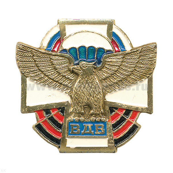 Значок мет. ВДВ (орел, крылья в стороны на бел. кресте с гвард. лентой)
