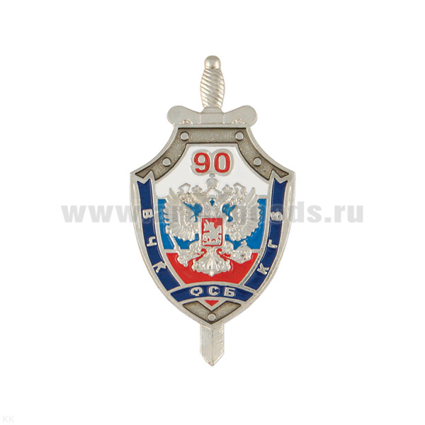 Значок мет. 90 лет ВЧК-ФСБ-КГБ (серебр. щит с мечом, хол. эм.)