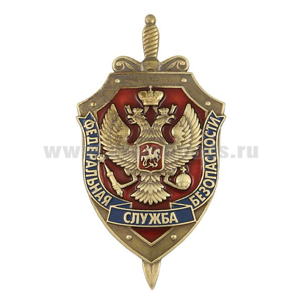 Значок мет. ФСБ с накладным орлом РФ (мельхиор, хол. эм.) на закрутке
