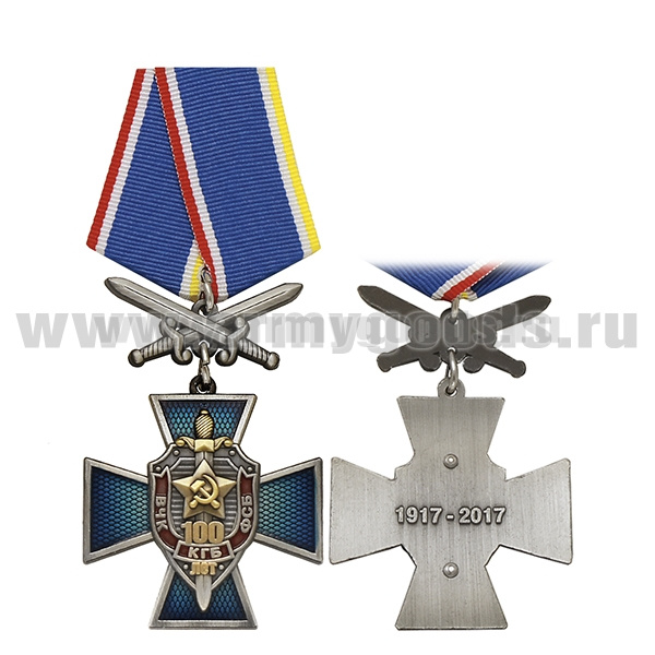 Медаль 100 лет ВЧК-КГБ-ФСБ (синий крест, колодка с мечами)