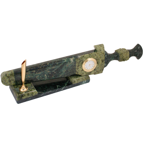 Часы сувенирные настольные с письменным прибором (камень змеевик зеленый) Кинжал в ножнах