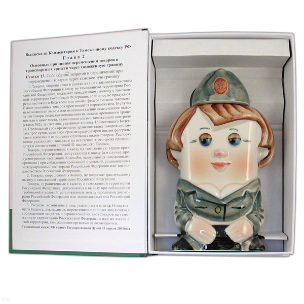 Главная-28 СУВЕНИРЫ, ПОДАРКИ-2816 ФЛЯГИ ФАРФОРОВЫЕ В КНИЖКЕ-ОБМАНКЕ-Фляга фарф. (0,25 л) в книжке-обманке Таможенница