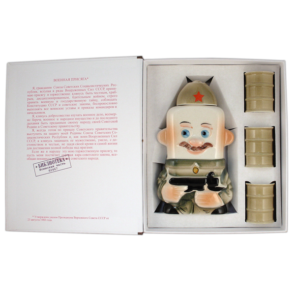 Фляга фарф. (0,25 л) + 3 рюмки в книжке-обманке Солдат с автоматом