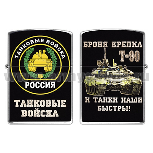 Главная-28 СУВЕНИРЫ, ПОДАРКИ-2842 ЗАЖИГАЛКИ БЕНЗИНОВЫЕ ЦВЕТНЫЕ-Зажигалка бензиновая цветная Танковые войска (Т-90) Броня крепка и танки наши быстры!
