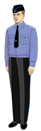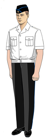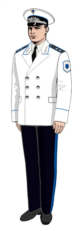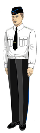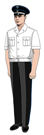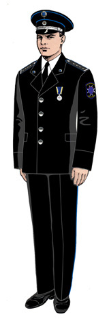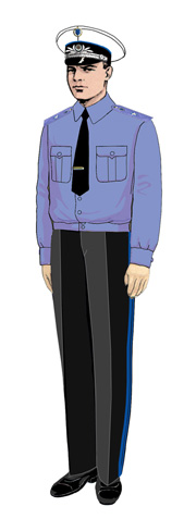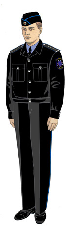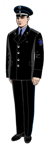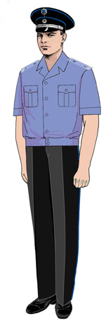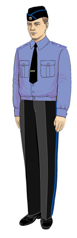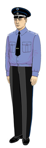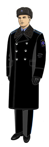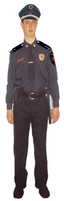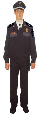Костюм специальный состоит из: куртки утепленной черного цвета с отстегивающимся воротником из искусственного меха; прямой куртки черного цвета на молнии, с планкой на поясе, отложным воротником, декоративными погончиками, нагрудными накладными карманами с клапанами серого цвета; параллельных брюк классического стиля черного цвета с синим кантом в боковых швах и со шлевками в форме трапеции под широкий ремень; рубашки черного цвета с декоративными погонами черного цвета и нагрудными карманами, с длинным или коротким рукавом; рубашки белого цвета с длинным или коротким рукавом; шапки-ушанки; фуражки европейского образца с кантами синего цвета.
