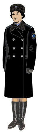Пальто зимнее двубортное, с отложным меховым воротником и лацканами, с тремя форменными пуговицами на каждой полочке. Полочки с боковыми поперечными прорезными карманами. Спинка со швом посредине, заканчивающимся шлицей, по талии пришивается хлястик, состоящий из трех частей, средняя часть хлястика прикрепляется к боковым частям четырьмя малыми форменными пуговицами (по две с каждого конца). Рукава втачные с обшлагами. На левом рукаве – нарукавный знак ведомственной охраны Минсвязи России. На пальто носятся нашивные погоны.