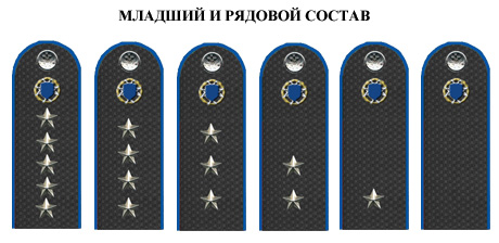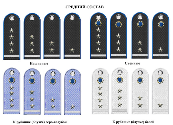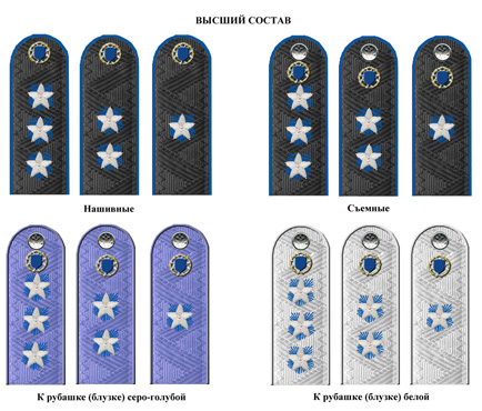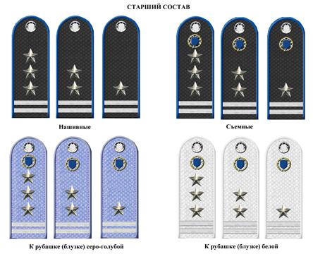Погоны высшего состава изготавливаются из галуна особого плетения, погоны старшего и младшего состава с гладким или галунным полем. Цвет поля погона устанавливается черного цвета. На поле погон высшего состава располагаются вышитые звезды серебристого цвета диаметром 22 мм, на поле погон для старшего состава – две поперечные полоски серебристого цвета шириной 5-7 мм и металлические или вышитые звезды серебристого цвета размером 20 мм. Нижняя полоска расположена на расстоянии 10 мм от нижнего края погона, расстояние между полосками 5 мм. На поле погон среднего состава – одна поперечная полоска серебристого цвета на расстоянии 10 мм от нижнего края погона и над ней металлические или вышитые звезды размером 13 мм. Звезды на погонах высшего, старшего, среднего и младшего состава располагаются вдоль продольной оси погона. Все погоны имеют окантовку синего цвета по всем сторонам, кроме нижней. В верхней части погон – пуговица.