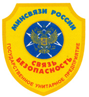 Нагрудный служебный знак размером 65х75 мм изготавливается из металла золотистого цвета и представляет собой щит с двумя боковыми выемками в верхней части. На щите изображен круг диаметром 28 мм, центр которого находится на расстоянии 45 мм от нижнего края щита. Внутри круга на синем фоне изображены стрелы серебристого цвета, расположенных в форме восьмиугольника с четырьмя стрелами. На стрелы наложено изображение двуглавого орла золотистого цвета. Сверху над кругом надпись синего цвета "МИНСВЯЗИ РОССИИ". Под кругом надпись красного цвета в две строки "СВЯЗЬ/БЕЗОПАСНОСТЬ". Вдоль нижней кромки щита буквами красного цвета, но меньшего размера, чем вышеуказанные надписи, слова "ГОСУДАРСТВЕННОЕ УНИТАРНОЕ ПРЕДПРИЯТИЕ".