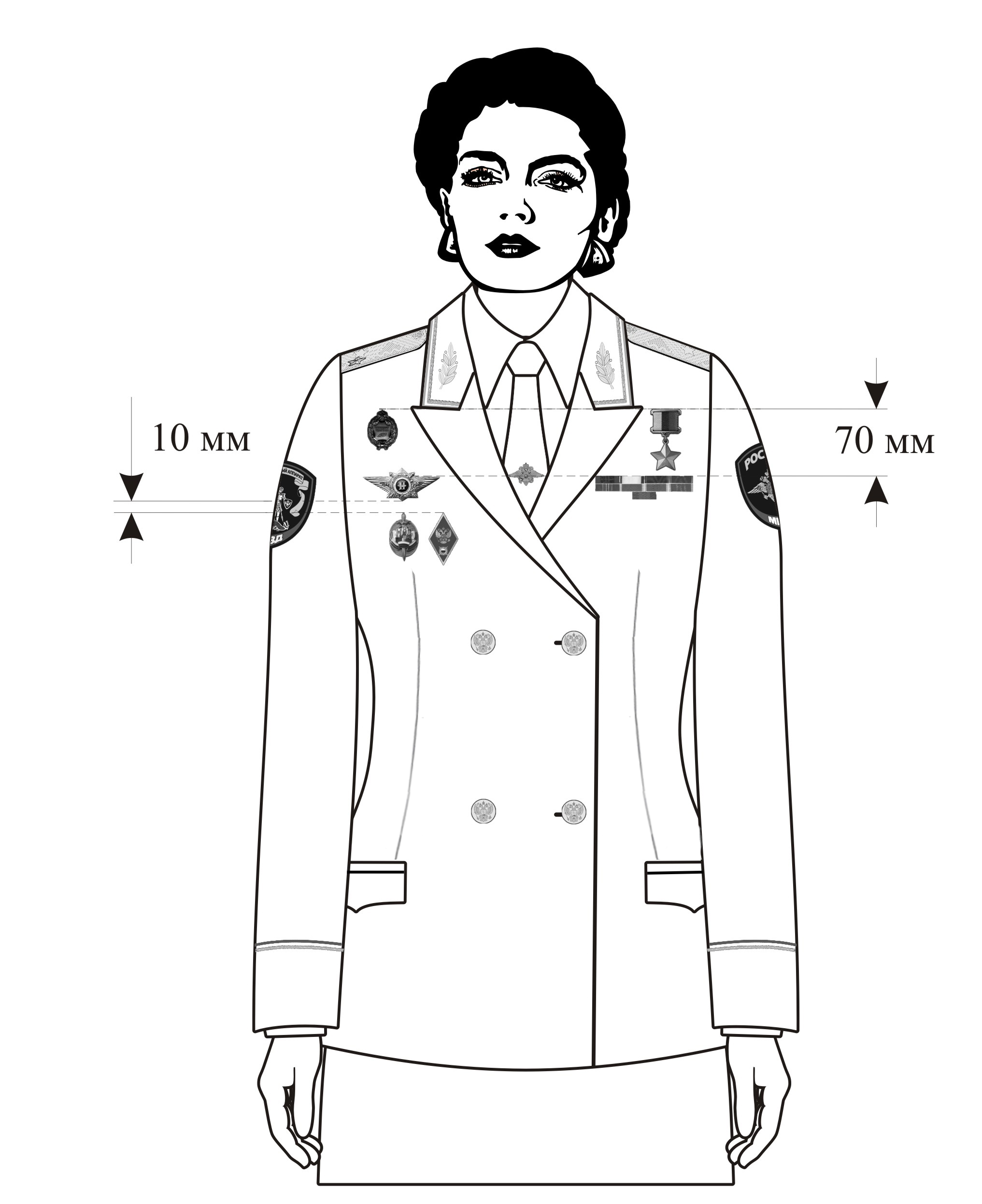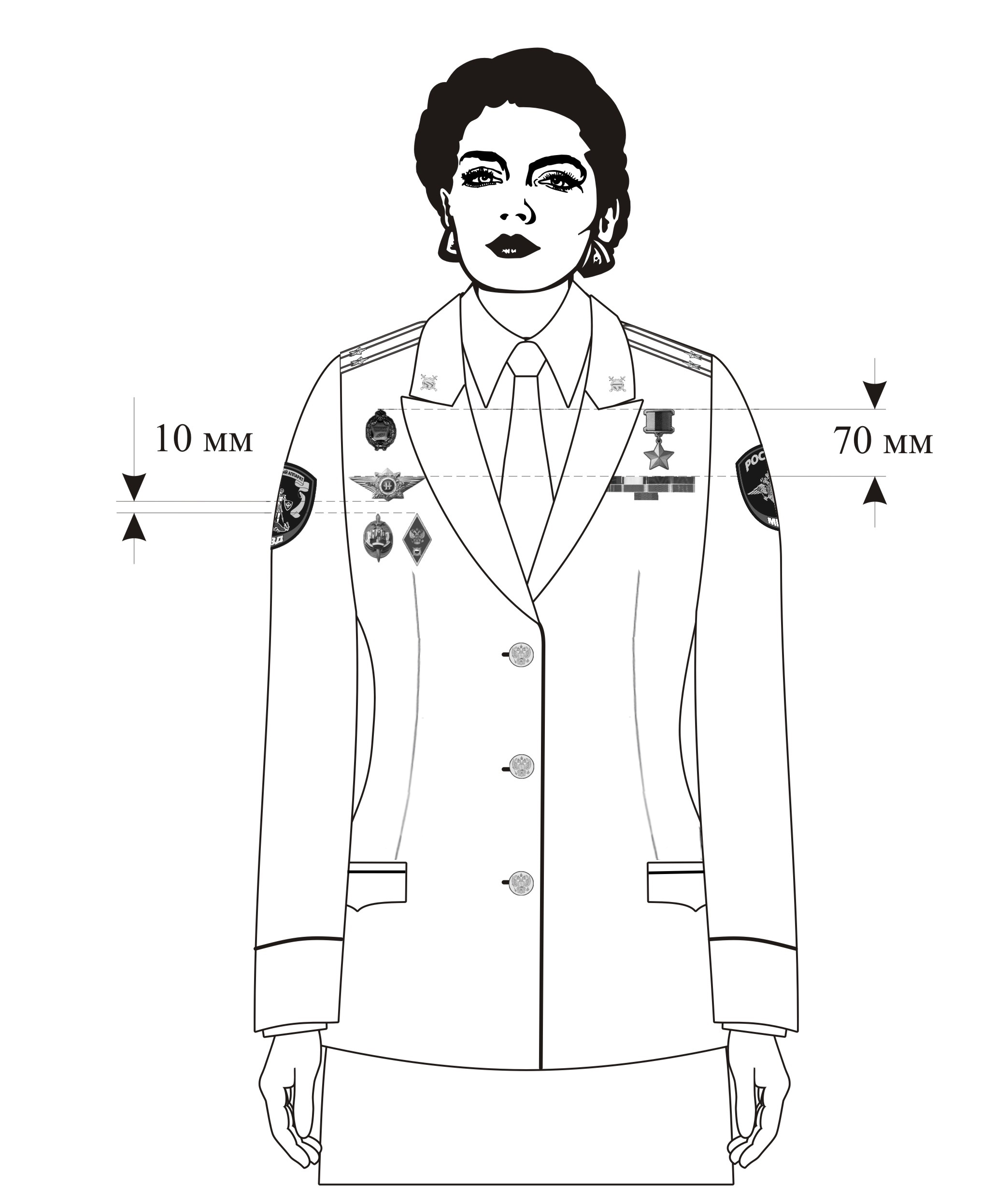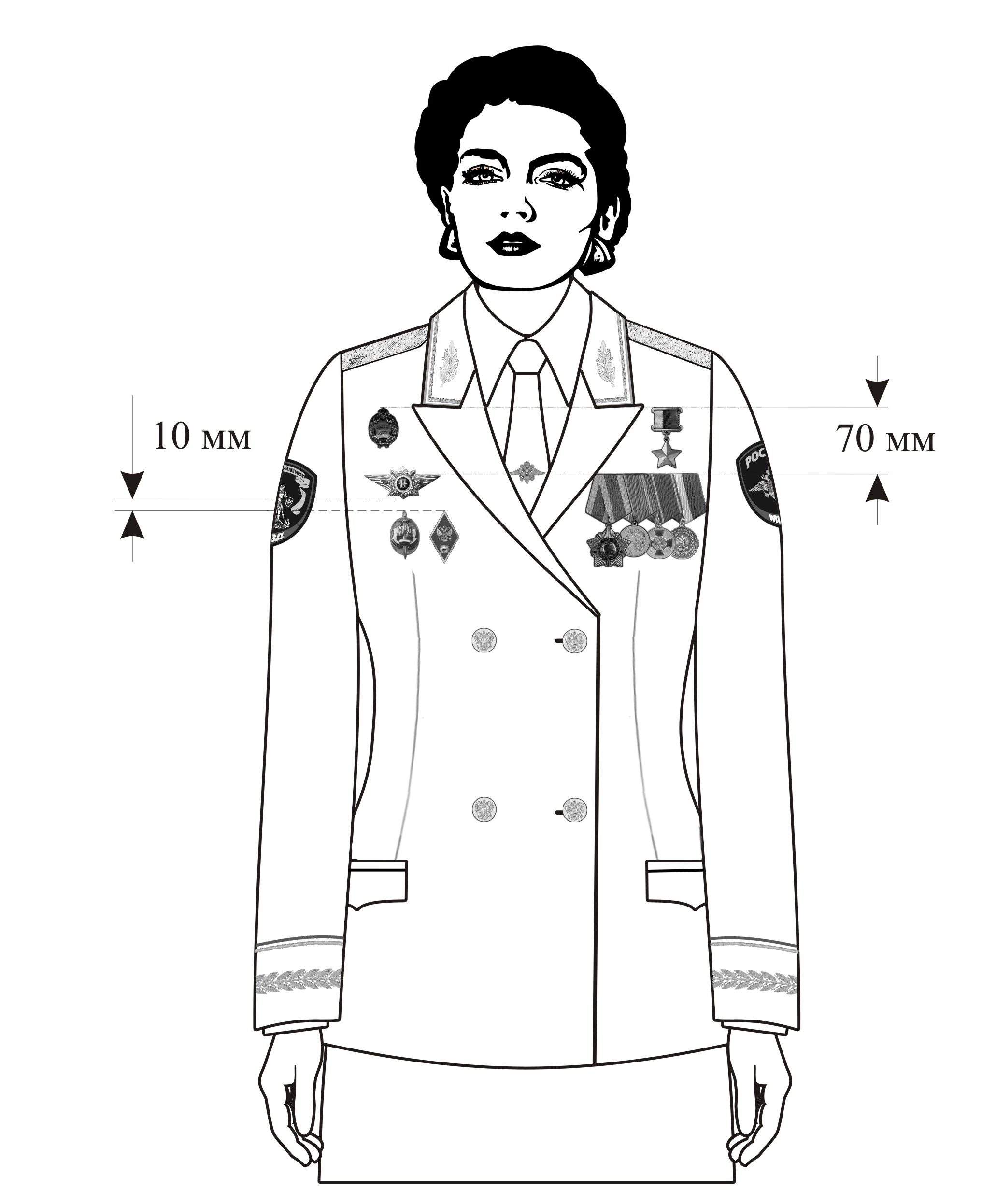 на двубортном кителе, жакетах – так, чтобы верхний край первого ряда планок располагался ниже уровня уступа лацкана на 70 мм;