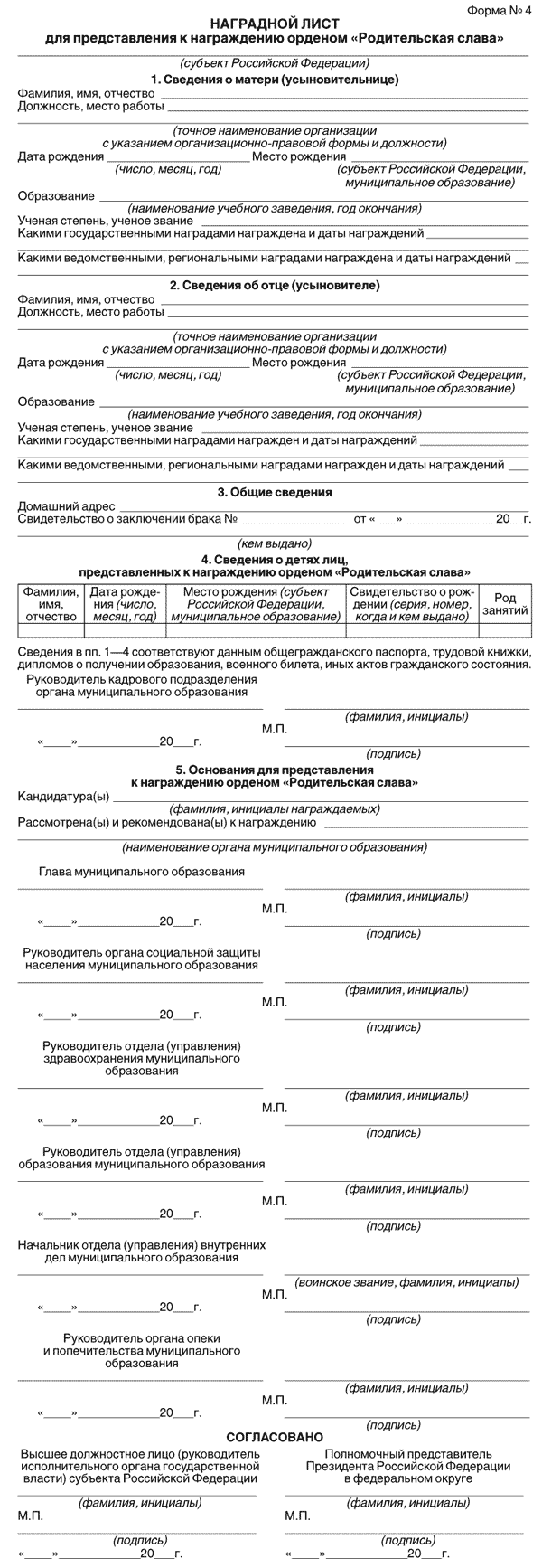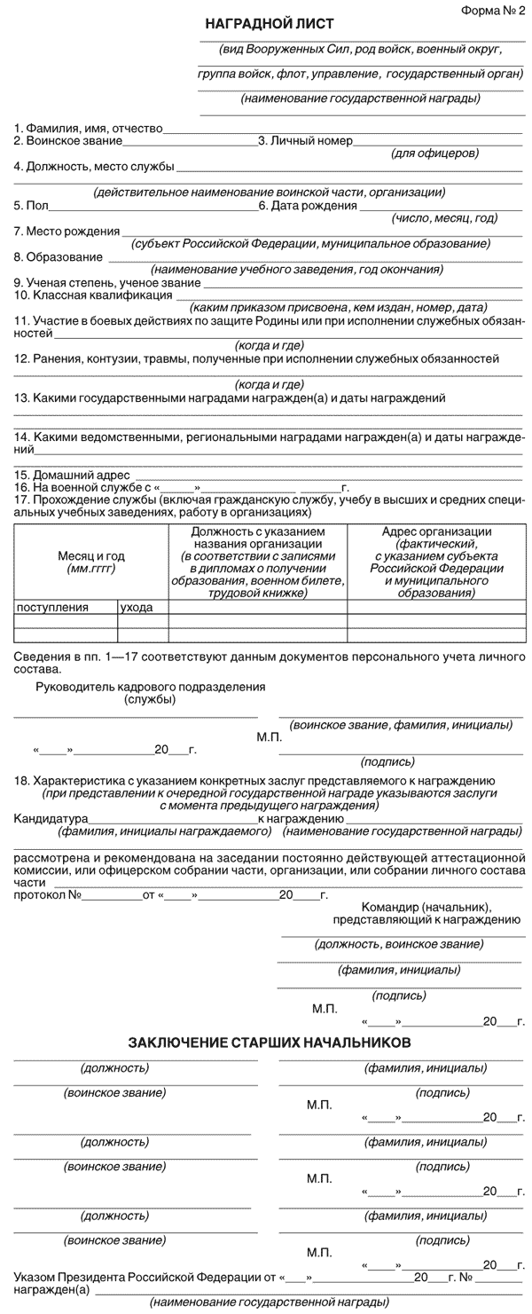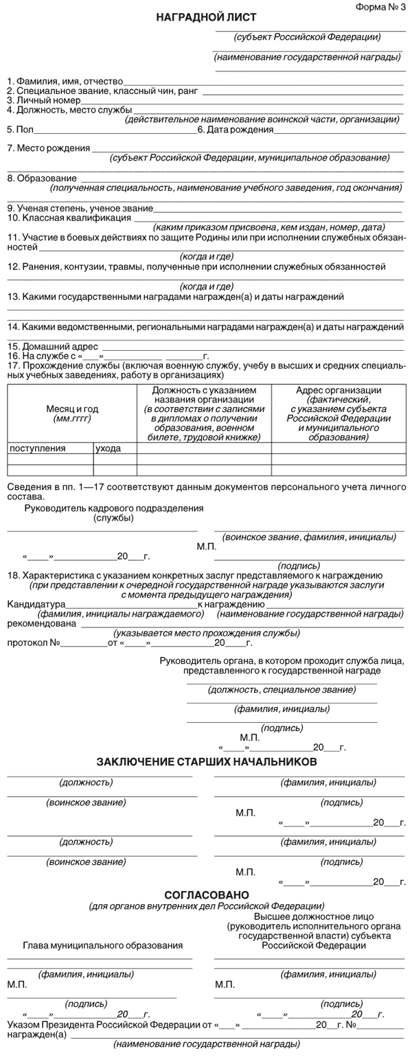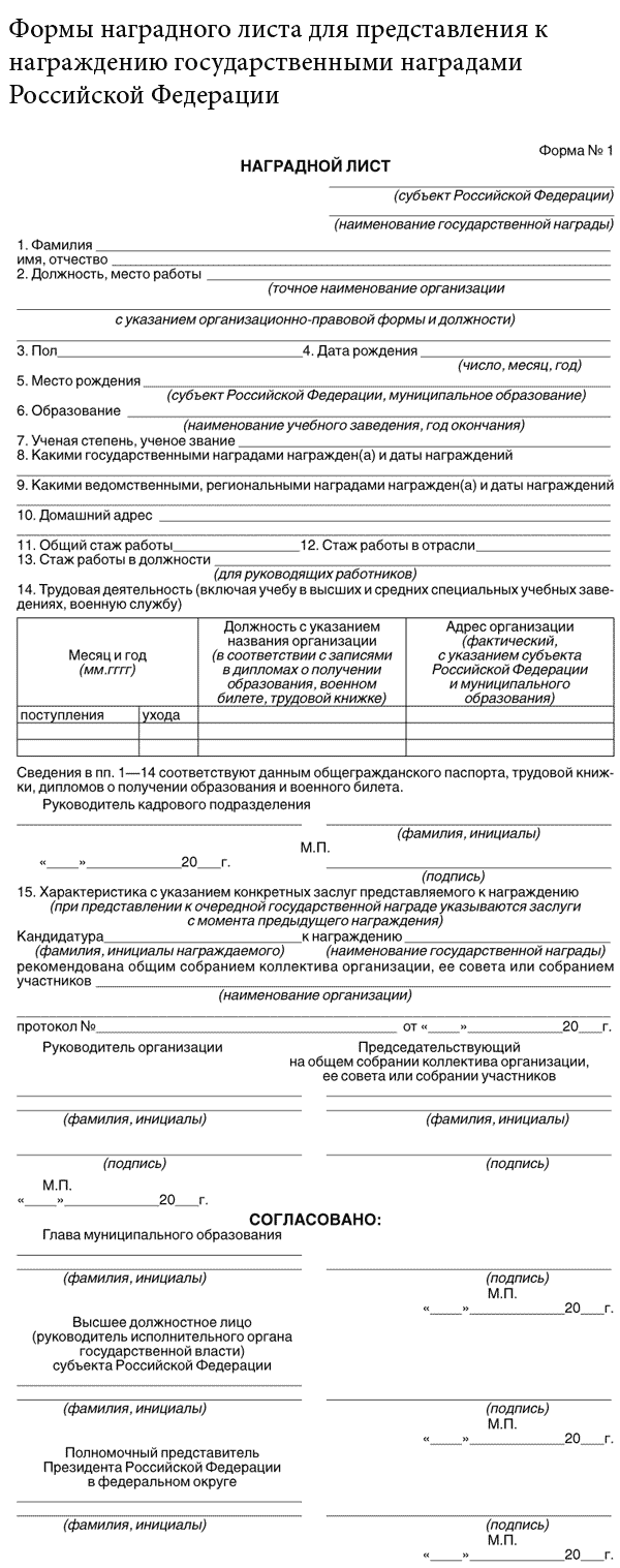 Формы наградного листа для представления к награждению государственными наградами Российской Федерации