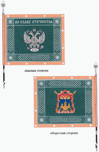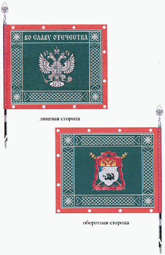 Полотнище знамени прямоугольное, зеленого цвета, с каймой красного цвета. Полотнище знамени и кайма обшиты серебристой тесьмой. По сторонам полотнища, в рамке, проходит серебристый плетеный орнамент. По кайме полотнища вышиты серебристые звездочки.