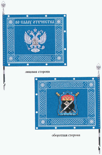 На лицевой стороне полотнища знамени, в центре, - вышито одноцветное серебристое изображение главной фигуры Государственного герба Российской Федерации: двуглавый орел, поднявший распущенные крылья. Орел увенчан двумя малыми коронами и над ними - одной большой короной, соединенными лентой. В правой лапе орла - скипетр, в левой - держава. На груди орла, в щите, - всадник в плаще, поражающий копьем опрокинутого навзничь и попранного конем дракона. В верхней части рамки надпись "ВО СЛАВУ ОТЕЧЕСТВА". Надпись выполнена серебристыми буквами, стилизованными под старославянский шрифт.