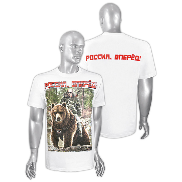 Футболка с рис краской Россия, Вперед! (Путин на медведе) белая