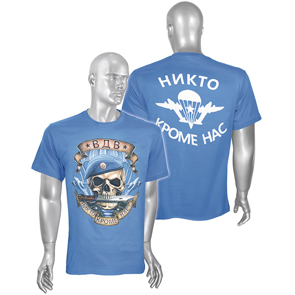 Футболка с рис краской ВДВ Никто кроме нас ! (череп в берете) голубая