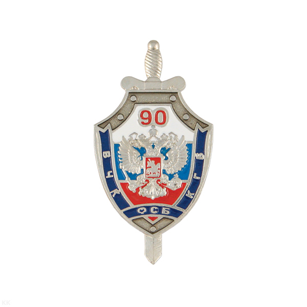 Значок мет. 90 лет ВЧК-ФСБ-КГБ (серебр. щит с мечом, хол. эм.)