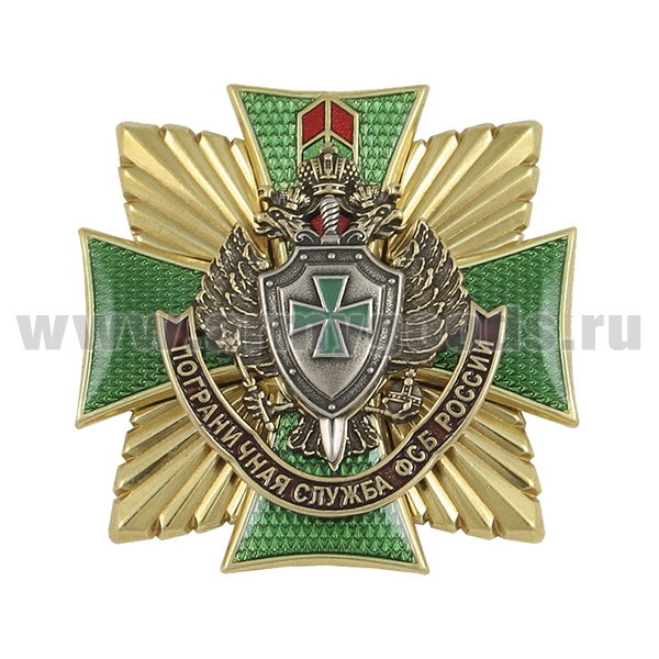 Значок мет. Пограничная служба ФСБ России (крест с лучами, 3 накладки, гор. эм)
