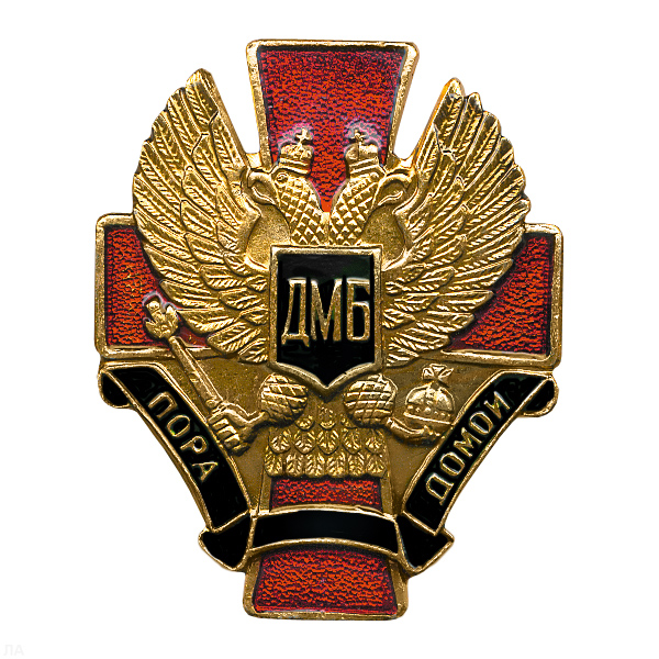 Значок мет. ДМБ пора домой (красн. крест с черн. лентой)