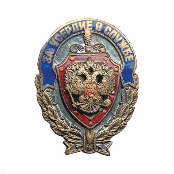 Значок мет. За усердие в службе (щит с орлом РФ) гор. эм.