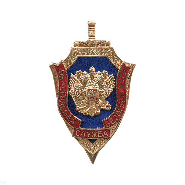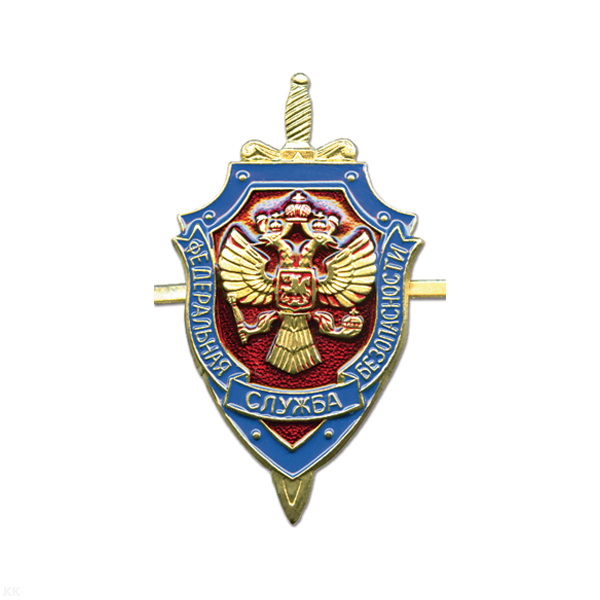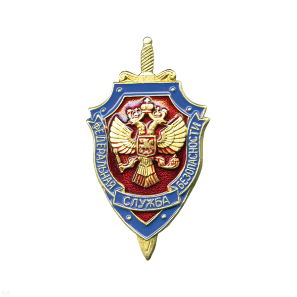 Значок мет. ФСБ с накладным орлом РФ (мельхиор, хол. эм.) на закрутке
