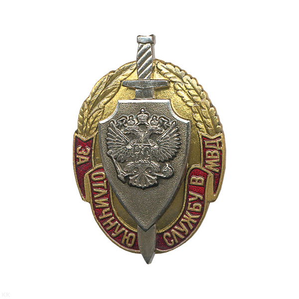Значок мет. За отличную службу в МВД (с гербом РФ) 2 накл., гор. эм.